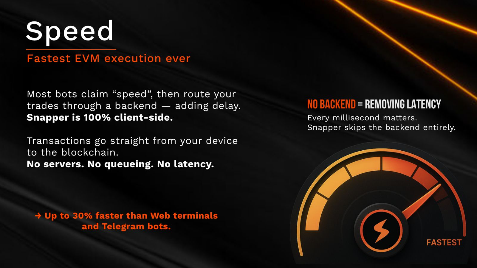 Most bots claim "speed", then route your trades through a backend, adding unnecessary delay. With Snapper your trade doesn’t go through a backend server — but directly from your wallet to the blockchain.⏱️ Faster than Telegram